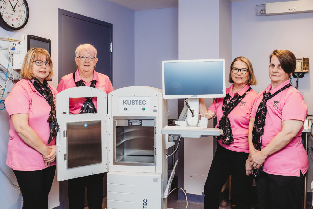 Photo Caption: Members of Women Alike Breast Cancer Survivors Society stand with the new KUBTEC imaging technology at Aberdeen Hospital. From left: Kim MacIvor, Faye Visser-Booth, Elizabeth Chenell, and Stacey Mitchell. Women Alike contributed $21,000 toward breast imaging upgrades that enhance surgical precision for patients in Pictou County.