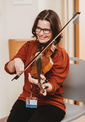 Today, Heather provides music therapy both at Aberdeen Hospital and in the community. Her visits may involve a one-on-one session with a single patient, or a gathering of family members sharing music together in a hospital room or living room. Each session is shaped around the individual.
