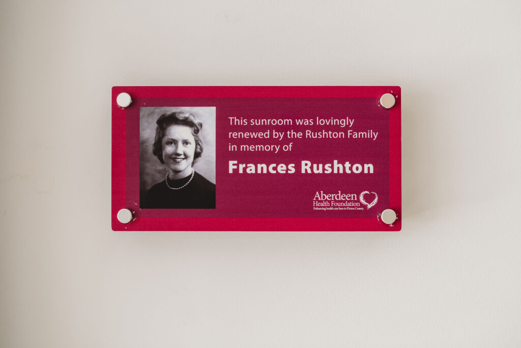 Photo Caption: A plaque inside the sunroom honours Frances Rushton and the Rushton family’s thoughtful donation to the space.