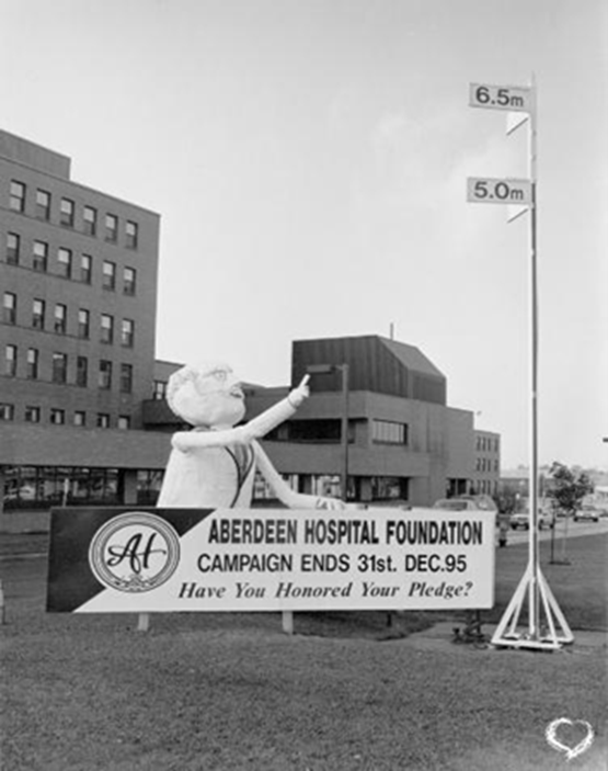 Royce’s own connection to the Aberdeen Health Foundation began years earlier. In the mid-late 1980s, he served on a fundraising subcommittee during the hospital’s original capital campaign. Drawing on his background in construction, Royce helped bring one of the campaign’s most memorable features to life, a large mechanical display known as Dr. Charlie, which he helped build and install outside the hospital to show fundraising progress. “He was swinging a hammer and ringing a bell as the lights went up the pole. It was a way to show the community how the campaign was moving forward.”
